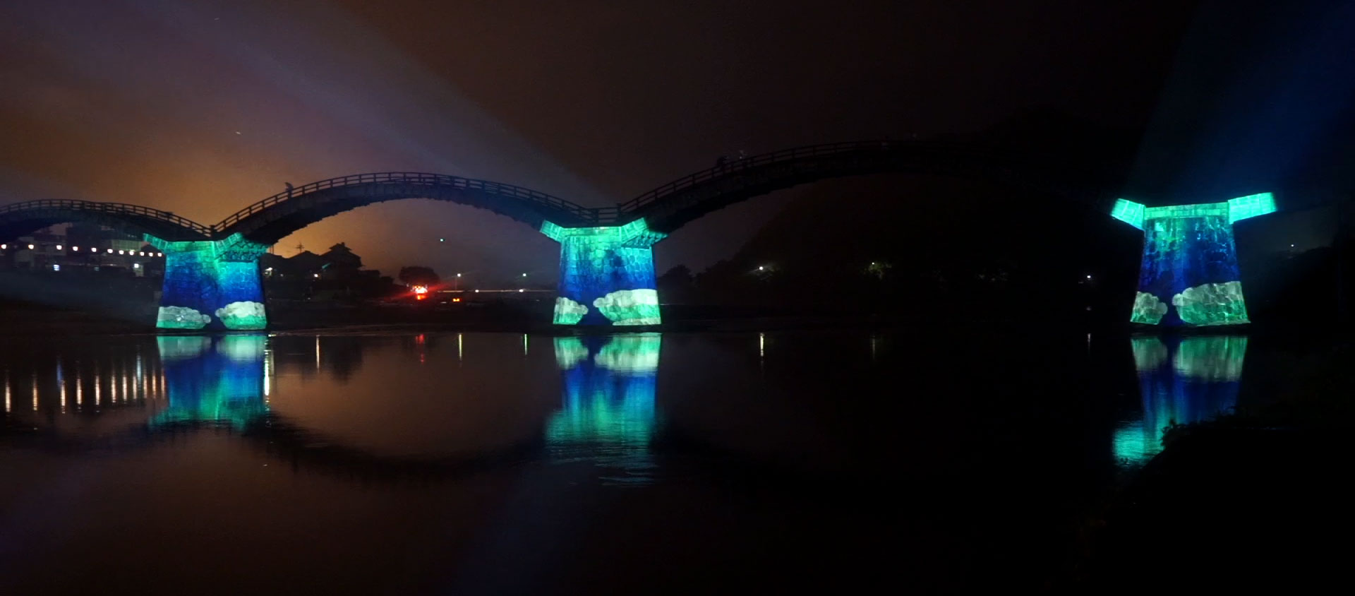 錦帯橋を中心とした風景は、山間部と清流からなる自然と太鼓状の橋が見事なまでのバランスで共存した、稀にみる絶景です。昼間だけでなく夜の暗闇においてもその素晴らしさを伝えることに挑戦したのが今回のプロジェクトでした。橋脚に投影された映像は川面へと映り込み、太鼓橋は雲の明かりによって美しいシルエットとして浮かび上がりました。映像そのものだけではなく、錦帯橋周辺の自然と一体となって初めて作品が完成したといえます。