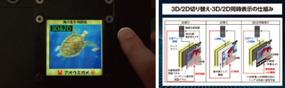 視点位置に応じて自然な3次元(3D)映像を表示する技術の研究を進めています。電気的に切り替え可能な光源アレーを用いることで、好みに応じて3Dと2Dの映像を選択して視聴できるディスプレーを開発しました。視聴者は、3D/2D表示モードやコンテンツ(海の生き物)を、ボタンで簡単に切り替えることができます。