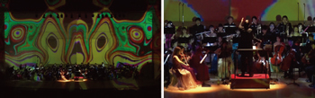 「360度映像による新感覚コンサート」 エール管弦楽団 音楽監督 鯵坂 圭司 通常バレエもしくは管絃楽のみで演奏される白鳥の湖をデジタル掛け軸を使用して演奏。ホールを包む映像から観客が結末を想像する仕掛けを作成。