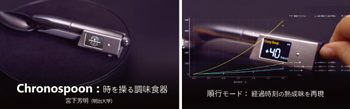「Chronospoon: 時を操る調味食器」 明治大学 総合数理学部 宮下 芳明 味の経時変化、特に熟成過程を味センサで測定し、味物質の添加量を数式としてモデル化することで、食品の味の時間変化を操れるスプーン。
