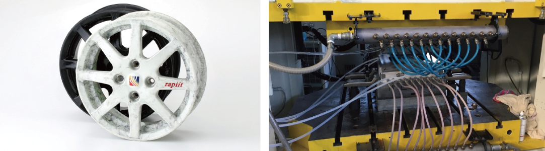 世界初の熱可塑性複合材(CFRTP/ガラス繊維強化樹脂)のプレス成形技術を活用したホイールを開発。複雑形状成形の自由度と高効率生産を両立し、軽量化・高強度を実現。自動車分野の環境負荷低減と次世代材料活用に貢献する革新的技術である。