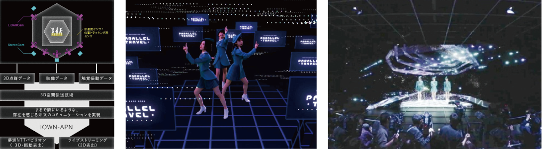 EXPO’70跡地とEXPO’2025夢洲会場をIOWN-APNで接続し、Perfumeのパフォーマンスを低遅延で計測・伝送・再現。夢洲会場では巨大3D LEDと床面の触覚振動により、視覚・聴覚・触覚を組み合わせた新しいライブ体験を提供。