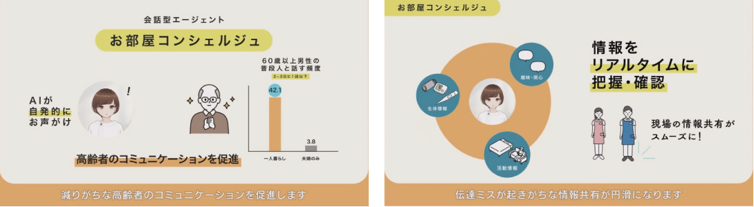 「音声対話AI「お部屋コンシェルジュ」」 東京都立産業技術大学院大学 五十嵐 俊治 お部屋コンシェルジュは、高齢者住宅で入居者と職員をつなぐ音声対話AI。日常会話から認知・気分の変化をリアルタイムで推定し、検査なしで認知機能を把握、職員の負担も軽減。