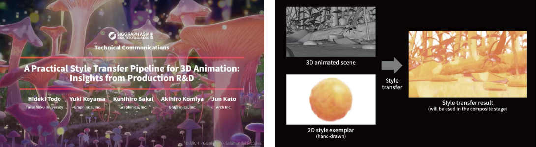 「3DCGアニメーション制作向けのスタイル転写パイプライン Forest Tale(Technical study ver.)」 平澤 直(アーチ株式会社/株式会社グラフィニカ)、小野 竜太、齋藤 史、小宮 彬広、酒井 邦博、小山 裕己(株式会社グラフィニカ)、藤堂 英樹(拓殖大学) 人物全身写真の照明効果を後処理で編集できる技術を開発。照明を新方式の離散表現で近似することで、強弱のある影や光沢をよりリアルに再現。