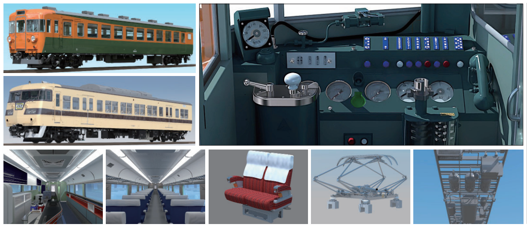 Shade3Dで再現された鉄道車両と各種パーツのモデル