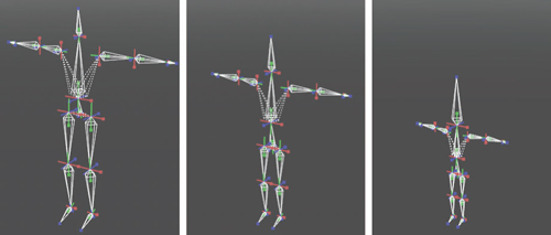 ・左からスタンダードボーン(親ボーンに接続:オフ)、中:スタンダードボーン(親ボーンに接続:オン)、右:正規化ボーン