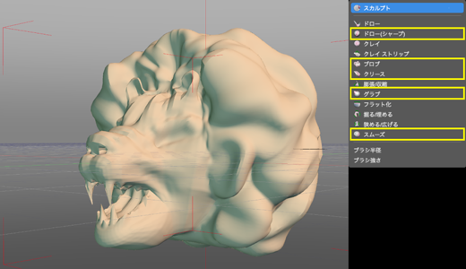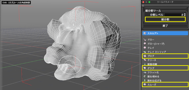 3.「再分割」でメッシュを細かくし、丸く盛り上げる「ブロブ」、つまみ上げる「グラブ」、滑らかにする「スムーズ」ブラシを使って顔、鼻、口、耳を整える |