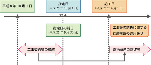 A7. 改正法附則第5条第3項《工事の請負等に関する税率等の経過措置》に規定する経過措置の適用対象となる契約は、平成8年10月1日から指定日の前日(平成25年9月30日)までの間に締結した次の契約です(改正法附則5(3))。