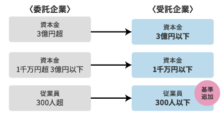 ③ 法適用基準の拡張(規制対象となる事業者の拡大) 従来の資本金基準に加え、従業員数による基準が追加されました。 ※プログラム作成委託・運送委託・倉庫保管委託・情報処理委託を含む ④ 手形払い等の禁止 従来は割引困難な手形の交付を禁止するにとどまっていましたが、通常の手形であっても受注者の資金繰りに係る負担が大きいことから、改正法では、手形払そのものを禁止しました(改正法5条1項2号)。 併せて、手形払以外の支払い方法(電子記録債権やファクタリング等)でも、支払期日までに代金額に相当する金銭(手数料等を含む満額)を得ることが困難であるものについては認めないこととされました。 これにより、製品や役務の受領の日から60日以内に現金で支払いが行われることになります。 おわりに