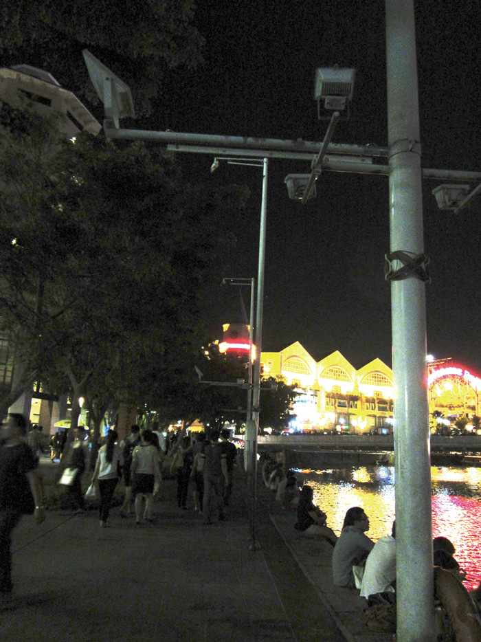 シンガポール川の川幅は対岸の様子まで見える距離。雁木も整備されている。人々が佇む雁木側の街灯は消されており、暗い遊歩道上から対岸の賑やかなクラークキー・フェスティバル・ビレッジをしっかりと眺めることができる【図9】。対岸では、川べりのカフェやバーで飲食や、バンジージャンプのようなアトラクションも。