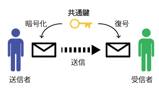 代表的な暗号化方法に共通鍵暗号と秘密鍵暗号という2つの方法があります。メッセージを暗号化・復号化するには鍵を使用します。共通鍵暗号方式では暗号化・復号化の両方に同じ鍵を使用します。メッセージ送信者は、暗号文の他に、鍵を受信者に渡す必要があります(図1)。