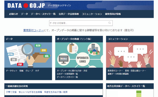 政府では、「電子行政オープンデータ戦略」(2012年(平成24年)7月IT戦略本部決定)に基づき「オープンデータ」の取り組みを進めており、この後「オープンデータ2.0」(2016年(平成28年)5月20日高度情報通信ネットワーク社会推進戦略本部決定)に基づいて、データ公開中心の取り組みから「課題解決型オープンデータ」の具体的な実現を目指し、さらに取り組みの強化が行われました。