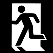 前者の修正によってピクトグラムは閉じられてしまう。閉じない場合は、走る人型を囲む空間が見る人を包む空間とつながって走る人は見る人の投影になる。ISOの安全標識は全て丸、三角、四角の枠で囲む。枠の形と色で避難、火災、指示、禁止、警告を区分するため、四角は四角に閉じなければいけないと思い込む。形は全てエッジで認識されるので新聞の文字を枠で囲んだら読めなくなるのだ。