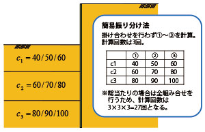 今回追加した「簡易振り分け法」は層ごとのパラメータの掛け合わせを行わない方法です。具体的には、図7の場合ですと、c1が40の時、c2とφ3は60と80を取り、c1が50の時、c2とc3は70と90を取るとします。この場合の全計算回数は3回となり、総当たりの場合と比較して大幅に計算回数が短縮できます。全組み合せを検討する総当たりに比べて信頼性は低くなりますが、検討条件によっては「簡易振り分け法」で充分な場合も考えられますので、状況に応じて使い分けることで、より効率的に逆解析を行うことができます。 |