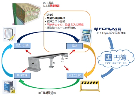 エンジニアスイート製品は、国土交通省が推奨しているCIMを支援しています。とりわけ、UC-1製品では、設計→数量算出(図面)→積算を実現し、UC-1製品の図面機能には、3D配筋を描画する機能を有し、鉄筋の干渉チェック、設計ミスの軽減する事ができます。