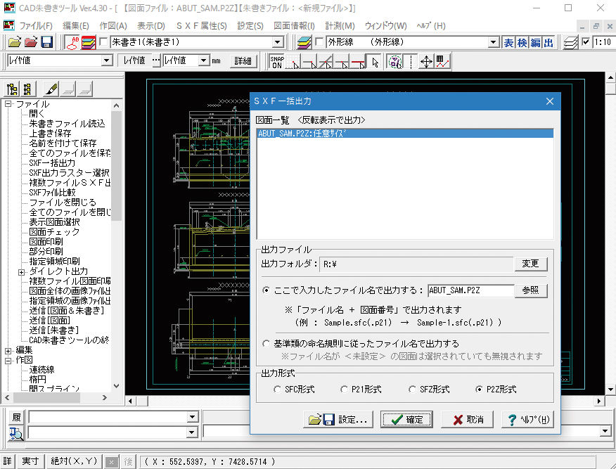 本製品に付属のCAD朱書きツールではSXF(P2Z)形式に対応しており、プレビュー、朱書き、一括出力などが行えます。