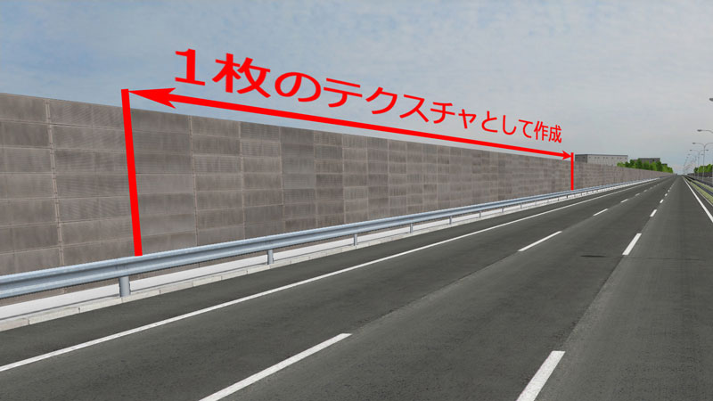 노면 질감이나 가드 레일, 방음벽 등의 도로 단면에서 사용되는 텍스처는 일반적으로 1 ~ 2m의 사각형 또는 폭을 맞춘 수직 (수평)의 질감을 4 ~ 10m마다 반복 설정할 때 사용합니다. 그러나 텍스처의 모양에 따라 같은 텍스처의 반복을 인식 가능하게함으로써 위화감을 초래할 수도 있습니다. 이 경우 텍스처의 반복주기를 60 ~ 100m 등 길게 설정하고 같은 모양의 반복되지 않는 매우 긴 텍스처를 붙이는 것으로 위화감을 줄일 수 있습니다. 외형의 정확성을 보장하기 위해 매우 높은 해상도의 이미지를 사용하는 것도 문제없이 대응 할 수 있습니다.
