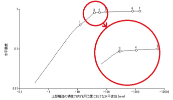 レベル2地震時解析後に、logP-logS法による変位急増点を表示しますが、図3までは行っておりません。現在は、荷重増分の各ステップの1つ前と1つ次の変位の変化率を算定し、最大変化率となる位置を変位急増点としています(図4-A)。