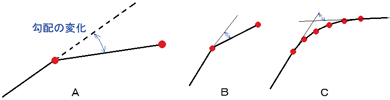 この方法では、最大変化点(図4-B)はわかりますが、一点の変化は小さくても複数点で連続変化する場合(図4-C)を見つけることはできません。このような場合、複数点の変化をまとめて最大値を判定する必要がありますが、何点までが適切であるのかという課題があり実現できていませんので、現在のlogP-logS法による変位急増点は、参考値としてお考えください。