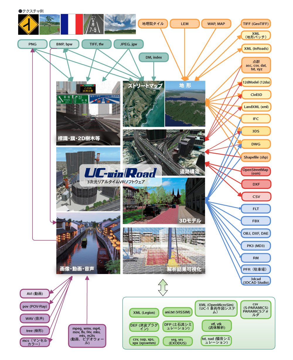 ■読み込み : OpenMicroSim(UC-1車両軌跡作図システム、VISSIM、S-PARAMICS、Legion)、xpswmm(DAT等)、 津波プラグイン(DEF等)、EXODUS(VRG等)、流体解析(VTK、VPF)、土石流シミュレーション(DFP等)、 騒音シミュレーション(TXT)