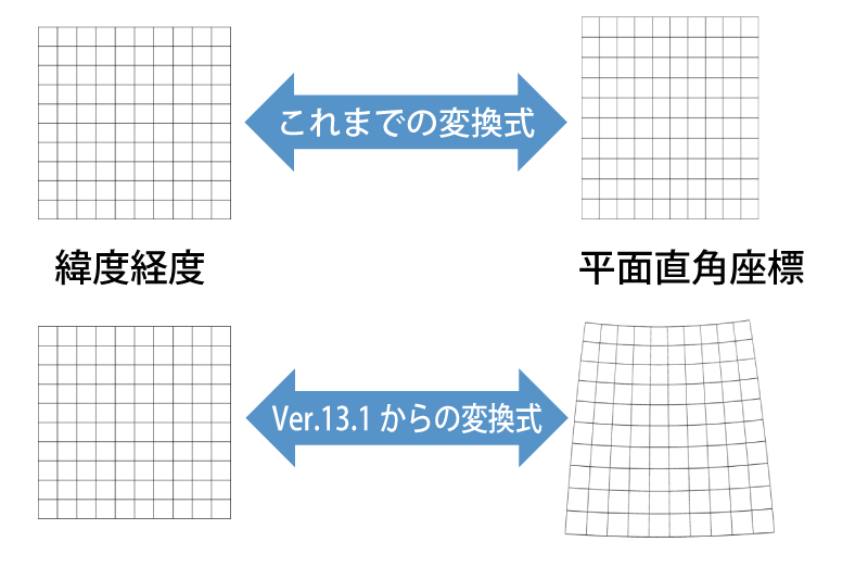 Ver.13.1使用项目中保存的坐标系情报,改进了地理坐标系(经纬度)和投影坐标系(平面直角座或UTM坐标)之间的转换,提高了数据的精准度。