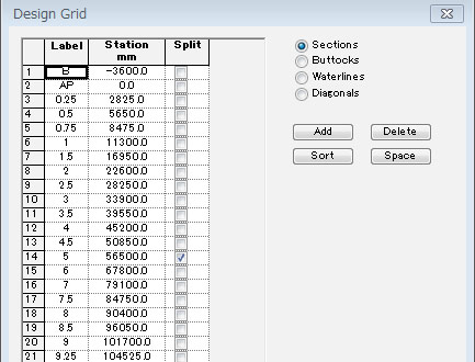さて、Maxsurfは三次元のサーフェイスモデラーですので、サーフェイス上の点の位置情報としてのオフセットを出すことができます。垂線間を分割したオーディネートや構造フレーム位置などのセクション、そしてバトックとウォーターのそれぞれの分割位置は、グリッド設定として行ないます(図1)。