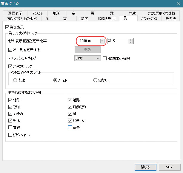 影の表示距離により、影が表示される範囲を設定します。範囲を狭くすると影がくっきり表示され、広くすると、影がぼやけます。目的に応じて、影を表示させたい必要な距離を設定します。例えば、日影シミュレーションなどのように影を途中で途切れさせない場合は、表示距離を長めに設定します。そのほか、近景の表示だけでよい場合は表示距離を短くするほど、輪郭がはっきりした影となります。