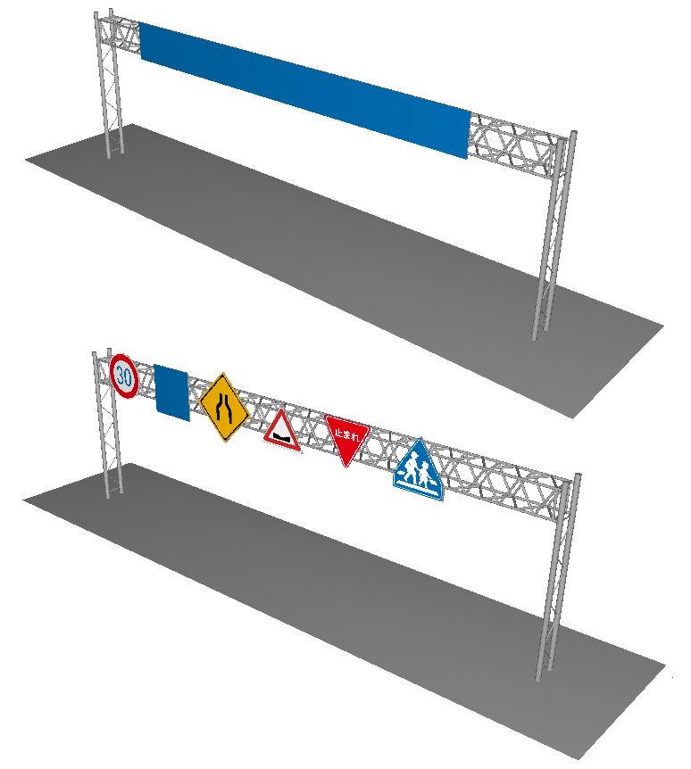 ところで、ハンドブックに記載されている門型標識の計算例では、図1(上)のように左右対称かつ標示板が1枚でなければなりませんでした。そこで、本製品では、単純梁の計算を応用し、図1(下)のような左右非対称および複数標識の計算に対応し、自由な設計を実現いたします。