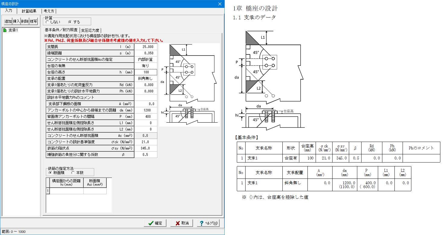 橋座の設計拡張 橋座の設計においては、「橋台の設計・3D配筋(部分係数法・H29道示対応)」でも既に対応している台座付きの橋座の設計に対応しました。平成29年道路橋示方書Ⅳ P.119下段に記載されているように支承が台座上に設置されている場合は、コンクリート抵抗面積から台座を除いた範囲で検討する必要があります。今回、台座の有無を選択することで検討が可能になりました。 |