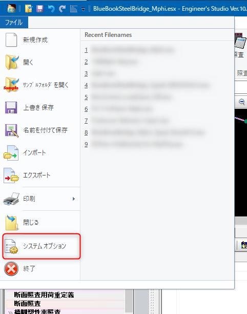 ナビゲーション「照査設定|断面照査用詳細入力」から呼び出す「照査用詳細入力プロパティ」(終局強度法-曲げ)画面上部に「簡易照査」ボタンがあります。このボタンを押すと終局曲げモーメントや終局曲率を確認できます(図1)。そこから詳細なレポート出力をすると、さらに詳しい内容が図2のように表示されます。 本記事では、レポート出力中の曲率(図2のC部)や中立軸位置の距離(図2のA部)、ひずみ(図2のB部)の値の有効桁数を多くする操作手順を説明します。 ひずみ、曲率 設定を行うには、図3のシステムオプションを呼び出します。 呼び出された画面で「入出力フォーマット」に入ります。ひずみや曲率の有効桁数を図4の赤枠部分(断面|ε、φ)で設定します。ここでは、単位や表示形式を変更することができます。表示形式には表1の種類があります。
