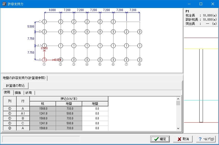 本機能は、入力の補助機能です。計算値の取り込みを行った後に許容支持力に関わる入力データに変更があった場合は、再度取り込みを行う必要があるのでご注意下さい。 ※許容支持力の入力単位を「杭単位」としている場合は、本機能を使用することはできません。 図4 計算値参照の許容支持力入力画面