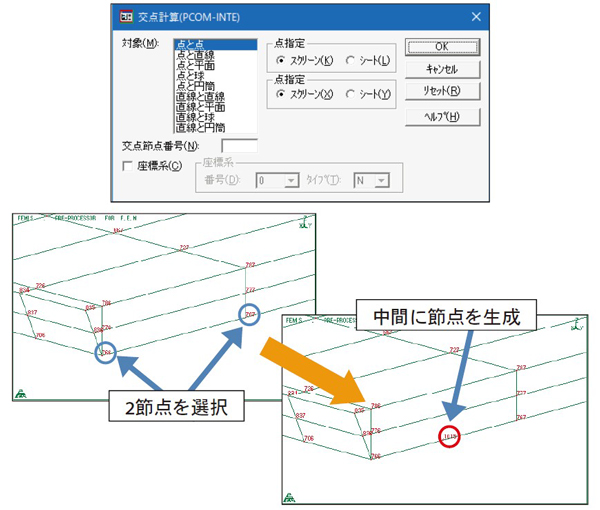 前回、切断面を指定して、その切断面で要素を分割する操作につ いて説明を行いました。 ただし、この状態ではモデル下部に他要素に比べて小さなPENTA要素が生成されていますので、さらに切断面要素分割を使ってモデルを修正する方法を紹介いたします。 切断面分割の実行 下図のモデルで、左端の1メッシュ部分にテーパーをつけるメッシュ分割を考えます。 2節点の中間に節点を生成するには[生成]-[交点]で「対象:点と 点」を実行します。 再度、 [変更]-[要素変更]-[分割]の切断面でメッシュ分割を行います。 切断面分割の注意点 切断面による要素分割で、切断面が向かい合う辺を分割する指定や、辺とコーナ点を分割する指定はOKですが、隣り合う辺を分割する指定はNGとなります。 これは、分割された形状が有限要素法には存在していない形状になるためです。分割後の形状が3角形/4角形(3次元の場合は3角柱/直方体)となるように切断面を指定してください。 2次元ブロックの結合による3次元要素生成 次回は切断面分割で不要になった要素を削除して、斜めになった断面に2次元ブロックを生成、そのブロック同士を結合して3次元メッシュを生成する方法を紹介いたします。 |