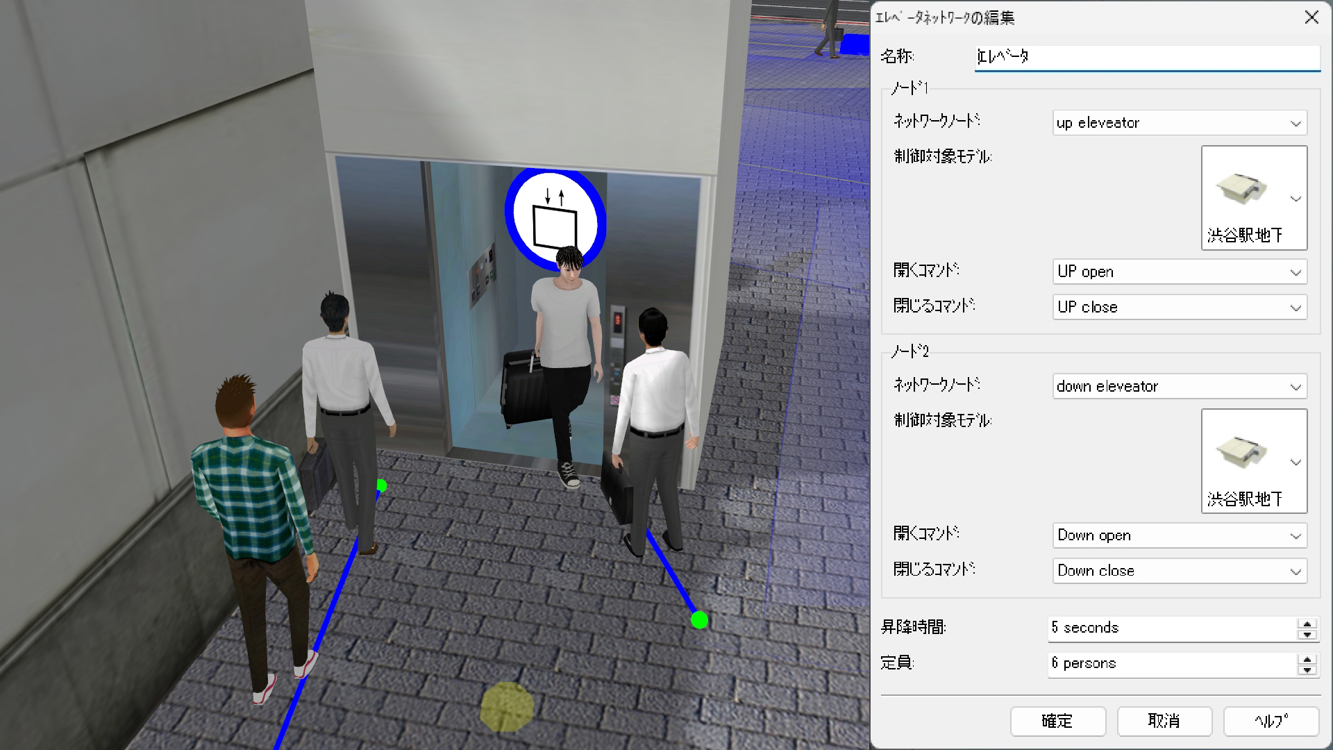 近年は、様々な方法で収集した人の移動の情報をビッグデータとして活用し、人流シミュレーションを行う事例が増えています。今回は、UC-win/Roadで人流シミュレーションを行う方法について解説します。 OD情報のみ存在する場合の人流シミュレーション 人の移動のOD情報(出発地点と目的地の情報)のみが存在する場合、歩行者ネットワークの機能を利用して出発地、目的地、移動人数を入力することで人流シミュレーションを行うことができます。人流の詳細な位置情報が存在する場合の方法は後述します。 歩行者ネットワークの作成 歩行者ネットワークは、幅を持たせた歩行ルート(パスウェイ)を空間上に引き、多数の歩行者を生成する機能です。歩道や広場などに面的にパスを引くことで人流をシミュレーションでき、ランダムな方向もしくはOD設定により目的地へ向かわせる動きを表現できます。作成するにはメニューバーの「編集」⇒「ネットワーク」⇒歩行者の項目で「新規追加」⇒ネットワークの項目で「新規追加」⇒パスウェイの項目で「新規追加」-「パスウェイ」の順に選択し、空間上にパスを引きます。 パスの端部にあたるノードには異なる複数のパスを接続し、広範囲の複雑な歩行者ネットワークを構築できます。パスの途中部分に接続したい場合は、途中の頂点をノードに変換することで接続が可能となります。パスを引いた後は、歩道や広場に合わせてパスの幅を調整します。混雑時は衝突を回避するために歩行者がパスからはみ出す場合もあるため、パスの幅は通行可能な幅よりも若干狭く設定してください。途中で道幅が変わる場合や障害物がある場合はパスを細かく分割し、場所ごとに幅を変えると良いです。 パスは進行方向を設定でき、片方向のみとすることも可能です。例えば左側通行の流れとしたい場合は、2本のパスを並べてそれぞれ逆方向の指定とすることで再現できます。また、フィルターを設定すると、事前に設定した属性の人だけが特定のパスを通らないようになります。 目的地の設定(OD設定) 新規作成した歩行者ネットワークは初期状態では歩行者がランダムに移動しますが、OD設定を行うことで特定の目的地に向かって移動する人流を生成することができます。出発/目的地はそれぞれネットワーク上のノード(「歩行者の発生・消滅」にチェックが入っているもの)を指定するので、ノードに個別の名称を入力しておくと便利です。OD設定への切り替えは「歩行者の生成」の画面でタイプをNormalからODマトリックスに変更します。 ODマトリックスでは指定可能な2点のノードを指定し、2点間を移動する人数の初期値、最大値、単位時間ごとの発生人数等を指定できます。目的地へのルートは最短経路が基本となりますが、混雑状況やエスカレータ等の利用の嗜好性によって変化する場合もあります。 歩行者属性設定 パス上を歩く歩行者は、キャラクタの種類ごとにカテゴリの区分を行うことで、移動速度などの特性やルート選択の嗜好性などを表現できます。カテゴリごとに、階段・エスカレータ・エレベータの選択嗜好性、一人あたりの専有面積、平面/階段/エスカレータの歩行時速度、エスカレータの歩行割合などの設定が可能で、カテゴリ自体も追加可能です。 この設定を応用すると、例えば雨天時の想定でシミュレーションする場合に、専有面積を広めに設定して移動速度を遅くすることで、歩行者が傘をさしている場合の人流を表現できます。その際、歩行者プロファイルで傘をさしているキャラクタを選び、描画オプションで雨を降らせると、よりリアルな見た目となります。 階段/エスカレータ/エレベータ設定 人流を再現するルート上に階段やエスカレータがある場合、まず階段やエスカレータに沿ってパスを引きます。その後、タイプの設定を階段もしくはエスカレータに切り替えることで、歩行者の挙動がそれぞれに適したものとなります。階段の場合は移動速度を落とすことができ、エスカレータの場合は立ち止まったまま指定の速度で移動するほか、立って乗る人と歩く人の割合を指定して表現できます。 エレベータの場合は、3Dモデルと連動させて表現します。ドアの開閉を表現した3Dモデルを配置し、ノードのスケジュール設定でモデルの割り当てと開閉コマンドの指定を行うと、エレベータで接続された2つのノード間の移動が表現されます。ドア周辺にはノードの待ち行列機能で行列の並び位置を引くことでエレベータ待ちの行列が再現されます。 移動経路の座標情報が存在する場合の人流シミュレーション 各個人の移動経路が座標情報として記録されている人流データがある場合は、CSVに書き出すことでマイクロシミュレーションの機能で人の動きを再現可能です。その場合、歩行者ネットワークの構築は必要ありません。 ■人流の読み込みに必要な要素設定 人流データの中に以下の要素が揃っている必要があります。その際、時間情報や位置情報は個人I