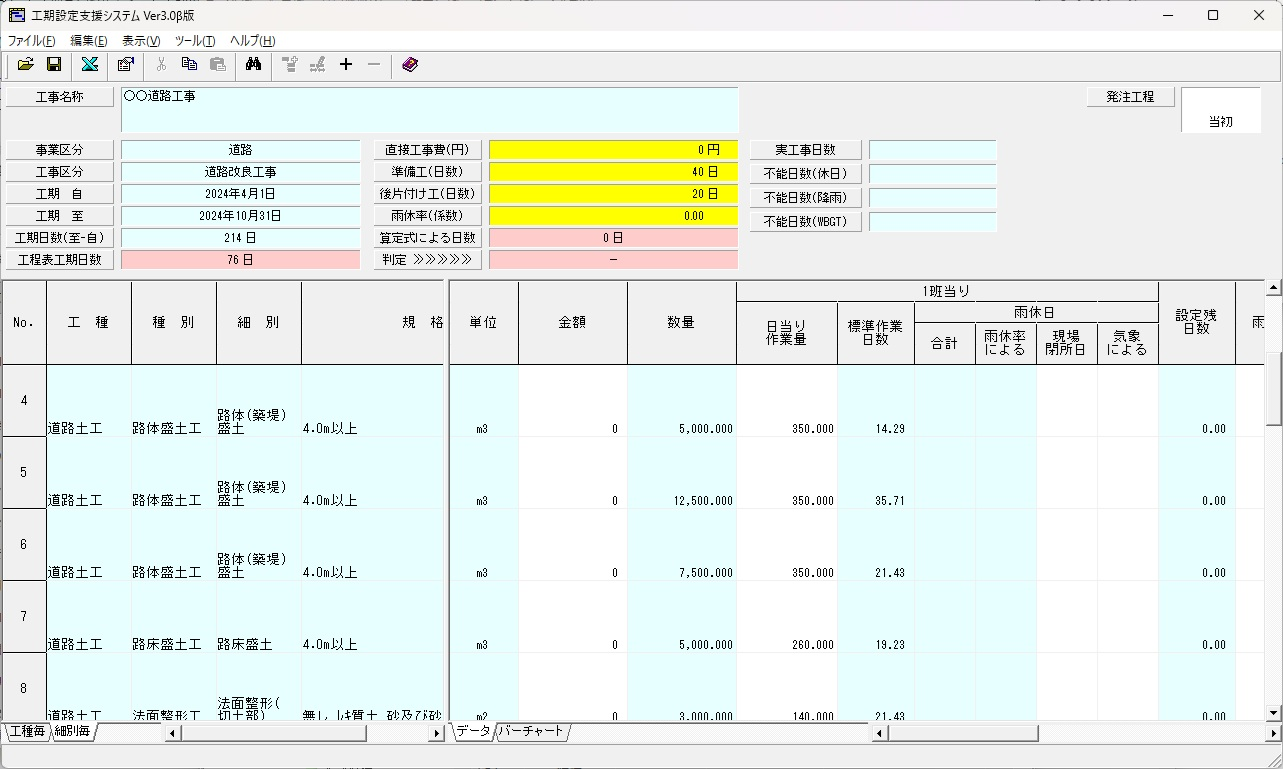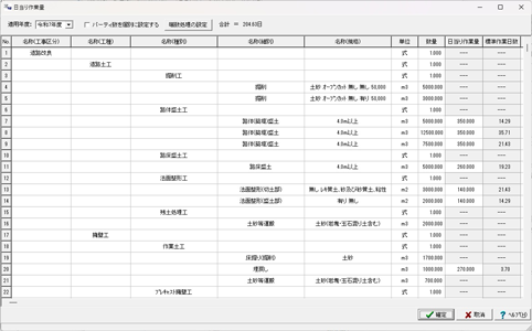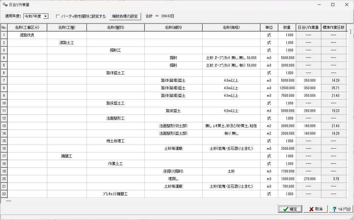 「令和7年度作業日当り標準作業量」及び「国土交通省土木工事標準積算基準書」(赤本)に規定される日当り作業量の算定に対応しました。入力画面および総括表出力時に、歩掛に基づいた日当り作業量及び該当工種における作業日数を表示・出力します。