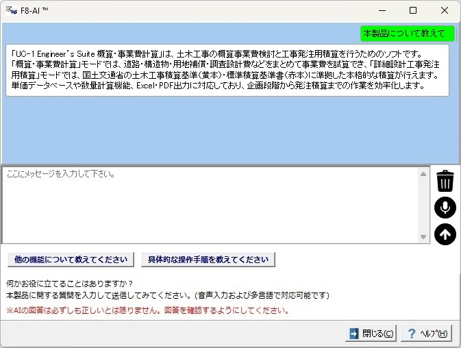 Ver.2では、UC-1シリーズで展開している「F8-AI™ UCサポート」に対応します。本機能は、入力操作に関する疑問や積算方法に関する考え方など、これまでサポート窓口へお問い合わせいただいていた内容を、AIによって製品内で解決できるようにするものです。多言語対応および音声入力にも対応しており、事業費検討や積算作業の効率化を実現します。