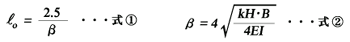 このChangの方法によると、自立式土留めの根入れ長(lo)は、式@にて算出することになります。式中のβ値は、杭の特性値と呼ばれているもので、式Aで求めます。