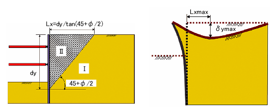 鉄道構造物等設計標準・同解説開削トンネル 平成13年3月 財団法人 鉄道総合技術研究所P.247に示されている考え方で、掘削断面が一般的な現場を対象に、最大沈下量推定図、並びに、最大沈下発生位置推定図から、図2に示すような背面地盤の最大沈下量(δymax)、発生位置(Lxmax)を推定します。本予測法は、2006年制定トンネル標準示方書開削工法編 平成18年7月 社団法人土木学会でも紹介されていますが、あくまでも得られた値については目安値程度であると記載されていますので、扱いには十分ご注意下さい。