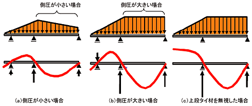 以上のような理由で、側圧の状態や二段タイ材の設置位置によっては、上段タイ材反力がゼロになる場合があります。この場合、構造力学的には上段タイ材は無用となりますが、タイ材位置をずらすなどの検討が必要と考えられます。