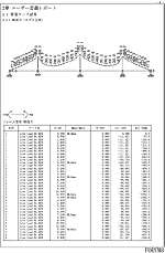 활하중의 계산 결과에는 2종류가 있습니다. 1개는 영향선 결과입니다. 영향선 결과는 활하중이 실려 있는 순간에서의 결과라고 말할 수 있습니다. 거기에서는 각 착안점 위치에서의, 영향선의 형상, 활하중의 재하 위치, 내역(p1, p2, T하중, 연행 하중 및 각 충격분)을 그림과 수치표로 표시합니다. 아래 그림은 그중의 한 예입니다. 영향선을 텍스트 형식으로 출력할 수도 있습니다.