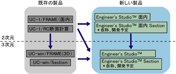[Engineer's Studio(R)면내]는 종래 제품[UC-1/FRAME(면내)]의 후계입니다(아래 그림 참조). 3차원 해석이나 비선형 해석이 필요하다면, 같은 조작성과 유사한 입력 화면을 가지는 [Engineer's Studio(R)](판매중)으로의 이행이 간단합니다. 또한, 장래 개발 예정의 새로운 단면 계산 프로그램(가칭:Engineer's