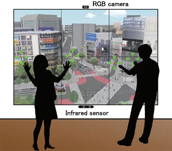 The infrared depth sensor allows the intuitive operation. In addition, the Multi-Cluster system enables the synchronism display on 6 screens.