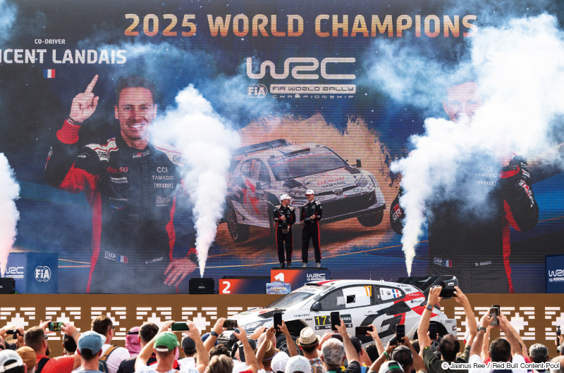 11月29日(土)トヨタのチームメイト、エルフィン・エヴァンスに暫定2ポイント差で臨んだセバスチャン・オジェは、最終日に勝負を決めました。総合6番手から3番手へと順位を押し上げ、タイトル争いの主導権を完全に掌握。最後のウルフ・パワーステージでも冷静な走りを貫き、41歳にしてセバスチャン・ローブと並ぶ歴代最多の9冠に到達。コ・ドライバーのヴァンサン・ランデにとっては初の世界タイトルとなりました。