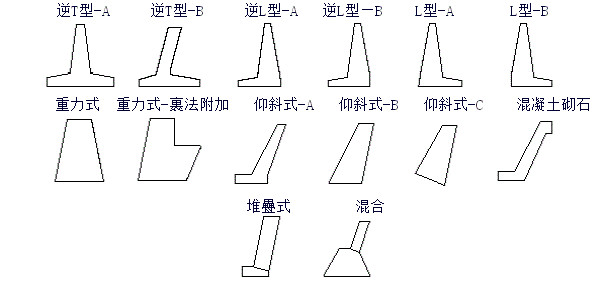 :逆T型-A、L型-B、逆L型-B、仰斜式(A~C)、堆疊式、重力式(一般形狀)