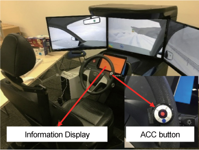 Firstly, regarding the operation of the automated driving system in the road environment in the winter season, Prof. Hagiwara set the role of side of road as "communicating risk events undetectable by the sensing system of the automated driving system such as road surface or visibility conditions ahead to the automated driving system". This research examines "provision of information for the drivers who are using Adaptive Cruise Control (ACC) on expressways in the winter season to avoid in advance the risks caused by slippery road surface (low-μ road) ahead". Then he measured the difference between 1) driving after providing the driver with information about low-μ road ahead, and 2) driving after providing the driver with not only information about low-μ road ahead but also measures to deal with it. Experiments using DS were incorporated since it was impossible to reproduce such situations on actual roads.