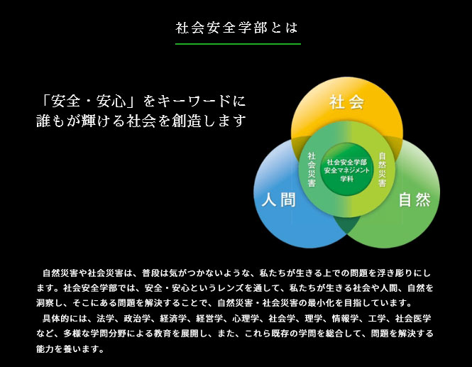"이런 이름의 학부는 국내대학에서 아마, 여기에만 있을 가능성이 높습니다." 이토 부교수가 말한 '사회안전학부'는 2010년 타카츠키 뮤즈 캠퍼스의 개설에 맞춰 대학원 사회안전연구과와 함께 설립되어 있습니다. '자연 재해'와 인위적인 재해인 '사회 재해'를 대상으로 한 연구·교육을 통해 관련 문제 해결이나 방재, 피해를 최소화하고 안전한 사회를 만드는 것을 목표로 하고 있습니다. 또한, 지진, 태풍과 같은 재해, 다양한 사고, 감염증 및 정보보안을 포함한 광범위한 분야를 문과 이과 윱합하여 다룹니다.