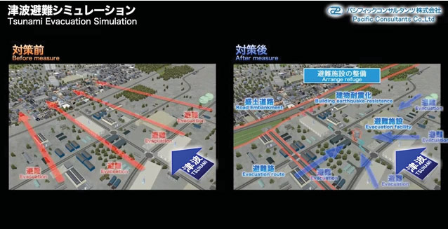 Another division to pick up in this feature, Management Division deals with management in diverse fields, such as administration management, town planning, construction of recycling-oriented society, and formation of urban and social spaces. Transportation Planning Dept. in the Division works on planning and analysis pertaining to every kind of transportation including automobiles, pedestrians, bicycles, railroad, and aviation. They have been working on traffic simulation as dynamic analysis in evaluating such plans for many years. Then after the Great East Japan Earthquake (2011), the evacuation issue has been attracting greater attention, and a need rose to create VR (virtual reality) based works from the analysis results of tsunami accumulated in another section in the company. Since Transportation Planning Dept. had also developed evacuation simulation by applying traffic simulation, UC-win/Road was adopted 2 years ago so that results of both simulations of evacuation and traffic simulation can be unified. Mr. Taichi Fudamoto in Transportation Strategy Section of the Dept. explains that tsunami evacuation simulation is under development based on 3D VR (three-dimensional virtual reality). So far they assumed occurrence of tsunami damage with towns in a coastal region as its models. They created simulation to compare the state of evacuation that changes over time between the period before and after taking measures against tsunami. Some of the results are shown from the official channel of PCKK of YouTube "PacificConsultantsJP" (opened up on August 13 2013, http://www.youtube.com/user/PacificConsultantsJP). They also plan to show them open to the public through events such as ITS World Congress Tokyo 2013 in October. He says that in the future they are planning to develop more advanced simulation and VR-based videos linked with planning of a specific project. Regarding their aim of utilizing VR, Mr. Teruo Yoshiike of the same Dept. says that evacuation simulation, which needs to be viewed and examined by a large number of people in public hearing and such, should be easy to understand; and that it is important for this purpose to develop VR-based videos that are easy to understand.
