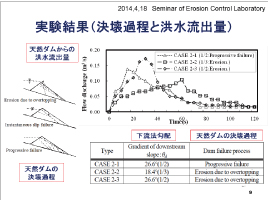 特に、土砂災害へのソフト対策や土石流(昔は“山津波”と呼称)への防災対策における自社の強みを敷衍。両大学との共同研究を通じ、高速道路盛土を土石流の堤防代わりに安全に有効活用するための構造(土砂と水との分離)を提案しています。さらに、工学的アプローチへICTを積極利用。土木の核となる水・土の各分野を繋ぐ領域に着目し、例えば、越流侵食決壊など、河道閉塞(天然ダム)決壊のメカニズムを対象とする解析技術を研究。土堤防の決壊メカニズムは複雑であるため、現象解明の一つとして、大学との共同研究として現地にて大型の決壊実験を実施。さらに、これらの現象を再現および予測するために解析モデルを提案しています。特に、越流侵食と土中の浸透流を複合的に予測する解析技術については、海外においても認められています(例えば、国際シンポジウムでExcellent