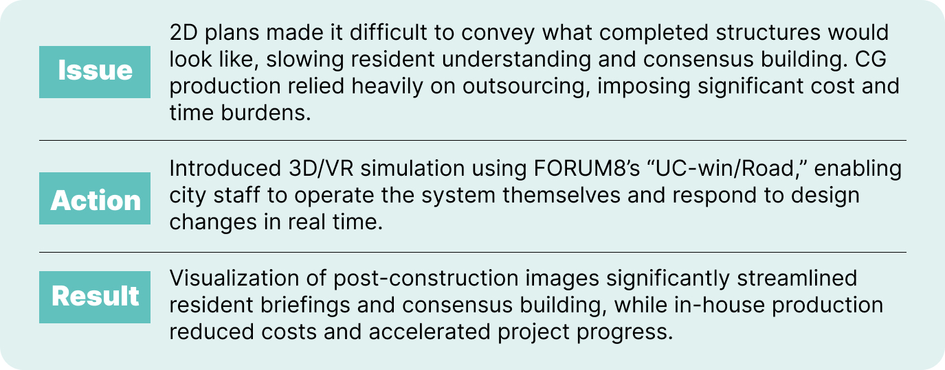 The Power of VR to “Make the Invisible Future Visible” The introduction of FORUM8’s 3D real-time virtual reality software “UC-win/Road” is one symbolic example of these initiatives. The development of the Linear Chuo Shinkansen requires large-scale infrastructure construction, making resident briefings and consensus building indispensable. Changes to roads and structures that were difficult to imagine using 2D plans can now be viewed from an aerial perspective or from a resident’s eye level through 3D simulations, greatly improving public understanding. “We placed strong emphasis on enabling our staff to operate the software themselves and create 3D simulations in-house,” says Yasuaki Matsuda, Deputy Director of the City Planning Department at Ena City Hall. By reducing reliance on external contractors, the city has been able to cut both cost and time. Resident feedback can be reflected on the spot — routes can be adjusted directly on the screen and the revised plan can be shown immediately. This ability to support real-time consensus building was a major reason Ena City adopted UC-win/Road. Mayor Kosaka recalls that when he first saw the VR content created in UC-win/Road, he initially wondered how costly it must have been. In reality, however, overall burdens in terms of both cost and time have decreased compared to when work was frequently outsourced and revised externally. Moreover, being able to respond instantly within the simulation to comments such as “Wouldn’t it be better if we adjusted this part?” has dramatically enhanced opportunities for dialogue. “Like a digital twin, we can test ideas virtually before applying them on-site. VR allows us to redo things again and again — before we enter the real world where time, effort, and money are much harder to spend,” the Mayor says. 24th 3D & VR Simulation Contest
