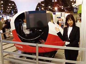 08年のITS世界会議(NY)出展では「Harmonious Mobility: People, Vehicles, Environment(『人・クルマ・交通環境』が調和した、将来の持続可能なモビリティ社会の実現)」をテーマに、トヨタの目指すモビリティ社会の提案とその実現に向けた取り組みの訴求を図るものと設定。そこでは、近未来での実用化が期待される「i-REAL」の走行デモに加え、新型の体験シミュレータが目玉として位置づけられることになりました。 |