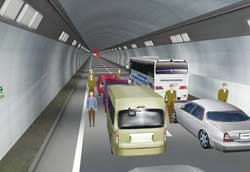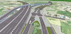 | 고속도로에서의 JCT・램프부 요금소 추가 공사 시뮬레이션. 요금소가 고가교상에 설치되어 있기 때문에 거더의 폭을 확장하는 공사의